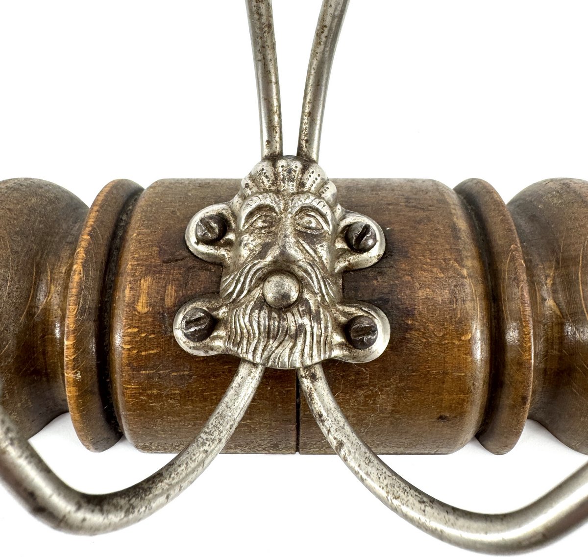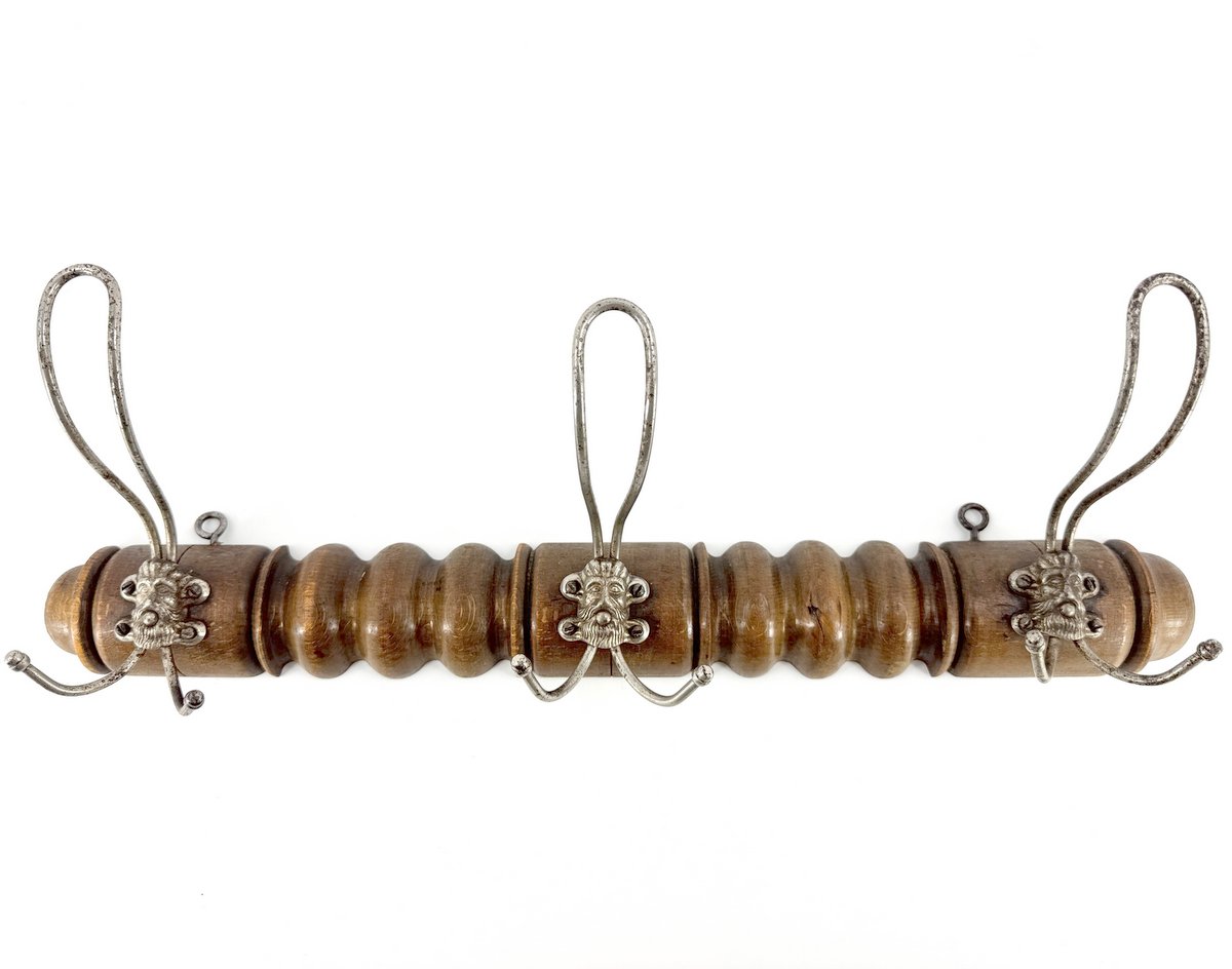 Circa 1900 3-hook hanging coat/hat rack with nickeled hooks featuring embossed masks at the center. Solid beech backboard, likely English.
