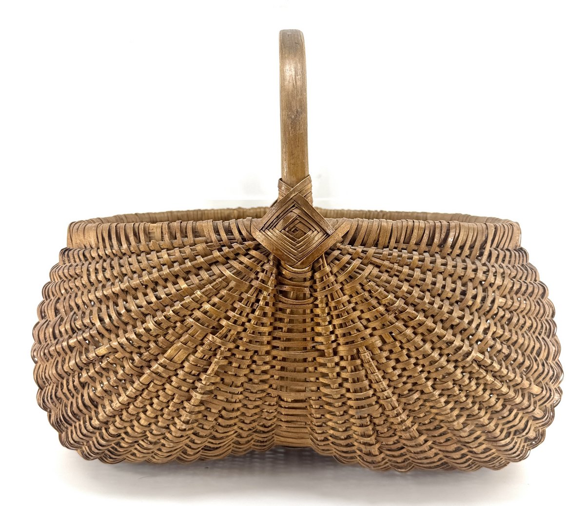 A good early woven splint buttocks basket with god's eye decoration. Excellent age toning/oxidation to the wood. Found in Shelburne.