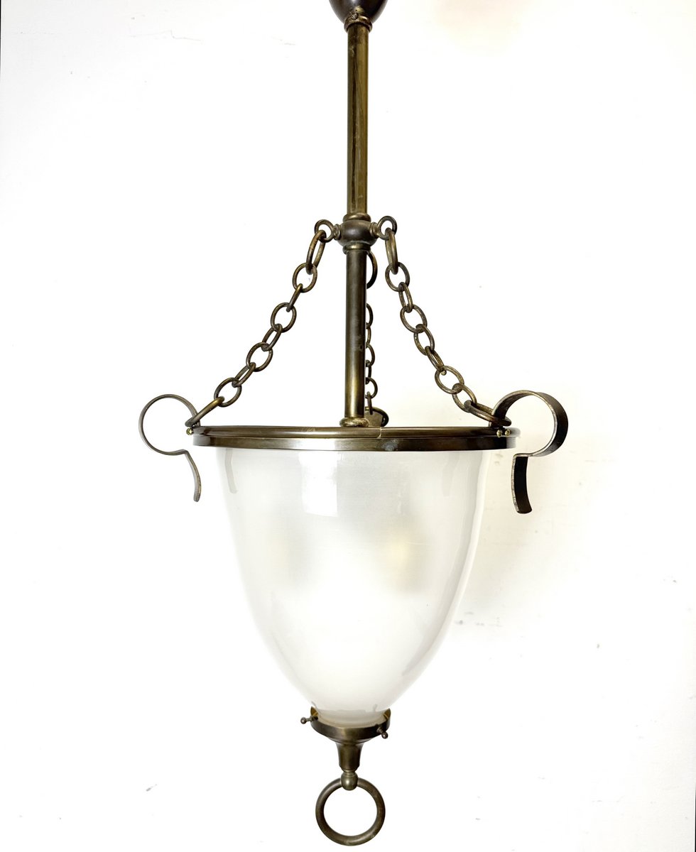 A good circa 1920s bell jar ceiling fixture with heavy brass housing. With mounting pole and canopy this light requires 36" of drop. The total fixture width is 15". Fully re-wired and ready for hanging.