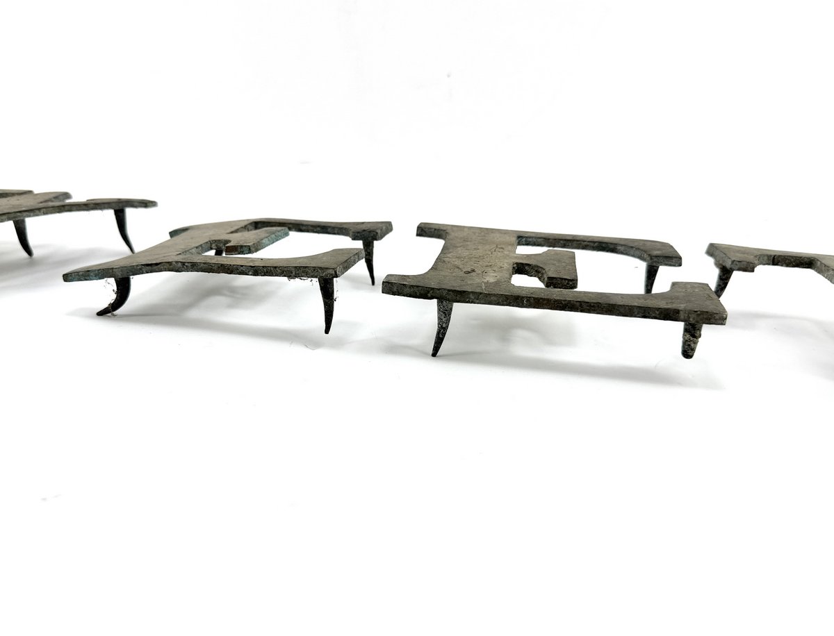 Set of solid cast bronze letters with prong backs designed to be inset into a stone building facade. Letters are 5" x 5". Circa 1920. Price is for the set.