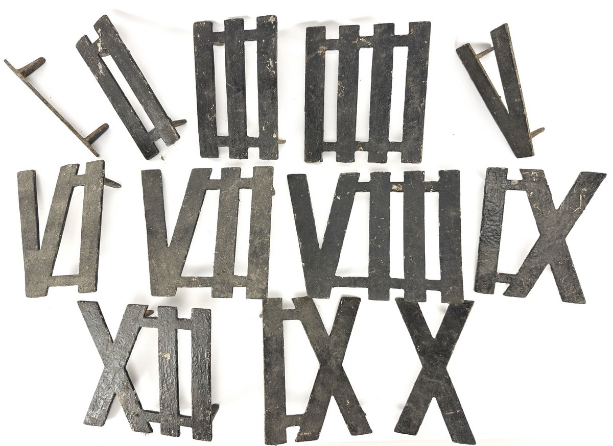 Late 19th century cast iron numerals for playing a Victorian lawn game referred to as "clock golf." You put a small hole in the ground (or draw a small target spot on the grass), and then place these cast iron numerals in a clock-wise circle at various distances from the hole. You putt your golf ball from each numeral and then record how many strokes it takes to complete all 12 positions. These numerals are 6.5" tall and all have their original spikes on the back for securing them into the ground.