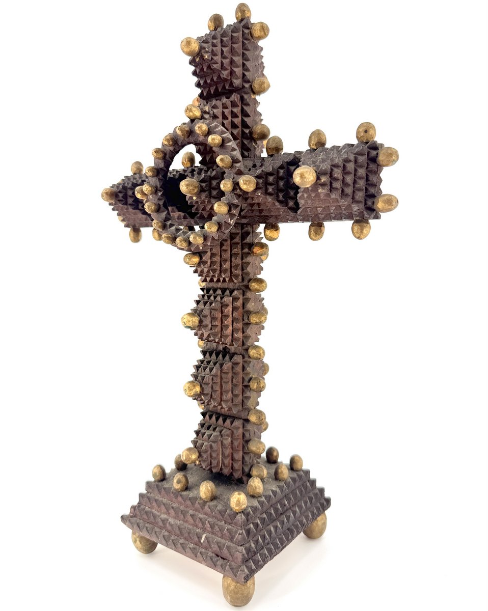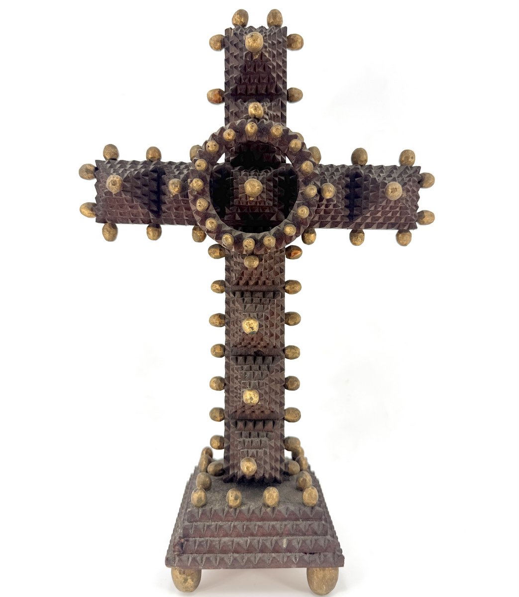 Chip-carved tramp art religious cross made to be free-standing. A complex design with a central ring and applied gold gilt balls. Excellent condition.