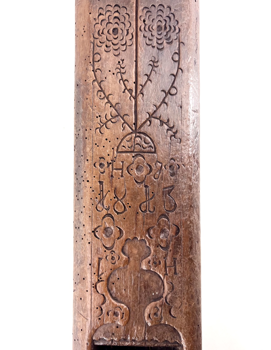 An impressive and large shipwright's long plane with carved-in decoration, owner's initials and date of 1813. Measures a whopping 42" in length and exhibiting a wonderful patina.The front handle looks like it's probably a later addition but certainly done many, many years ago. This monumental piece was likely brought to North America by a European immigrant in the early to mid-19th century.