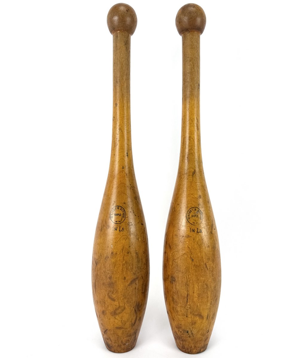 A pair of 1.5-pound solid maple exercise clubs manufactured by Wright & Ditson circa 1900. Nice colour and honest wear. Price is for the pair.