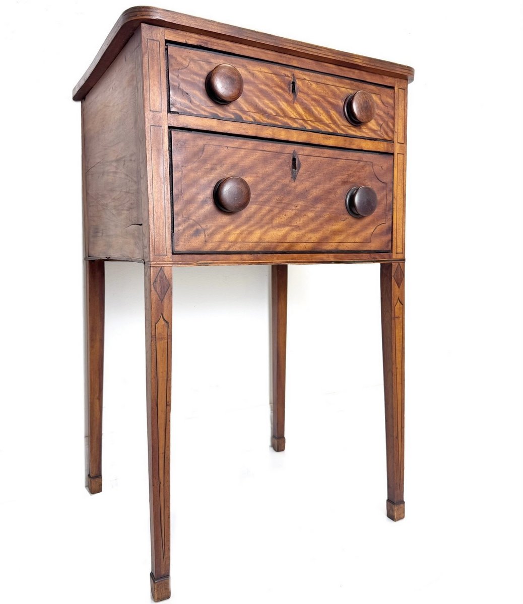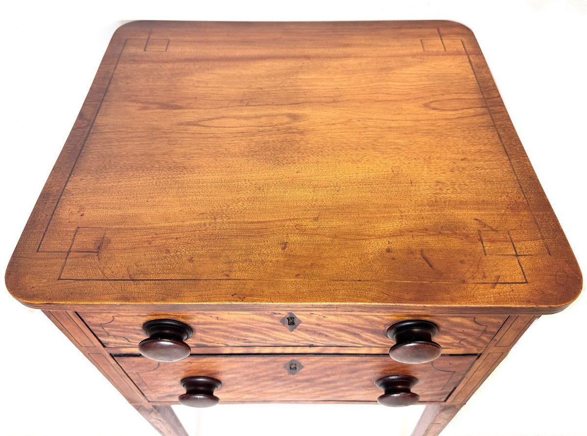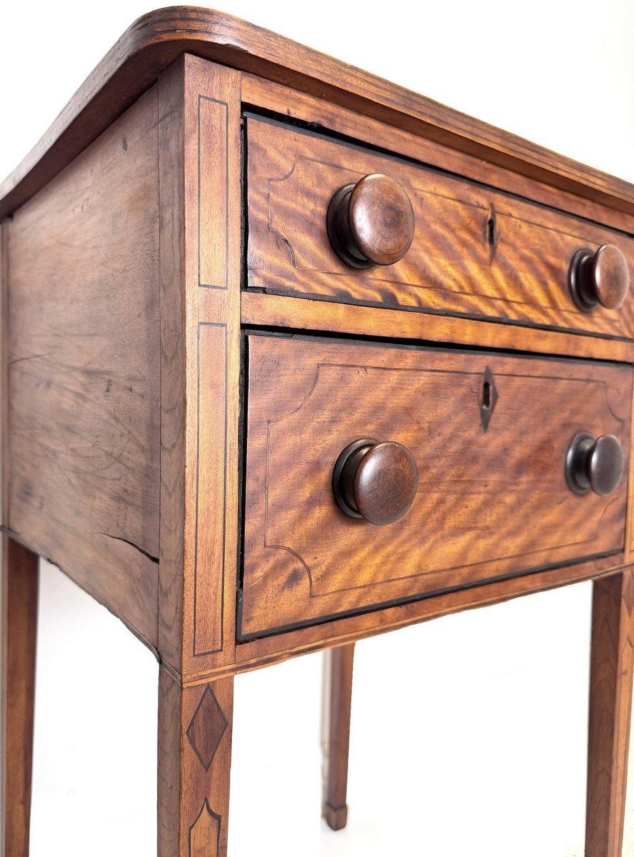 First-rate early 19th century Nova Scotia 2-drawer stand in old, original dark finished flame birch with inlaid decoration. Square tapered legs, original pulls, diamond escutcheons. Some minor loss to the string inlays on the drawer edges, otherwise good. A fine, untouched stand circa 1820. From the well-known Kent Lodge, Wolfville collection of the late Reg & Pat Moore.