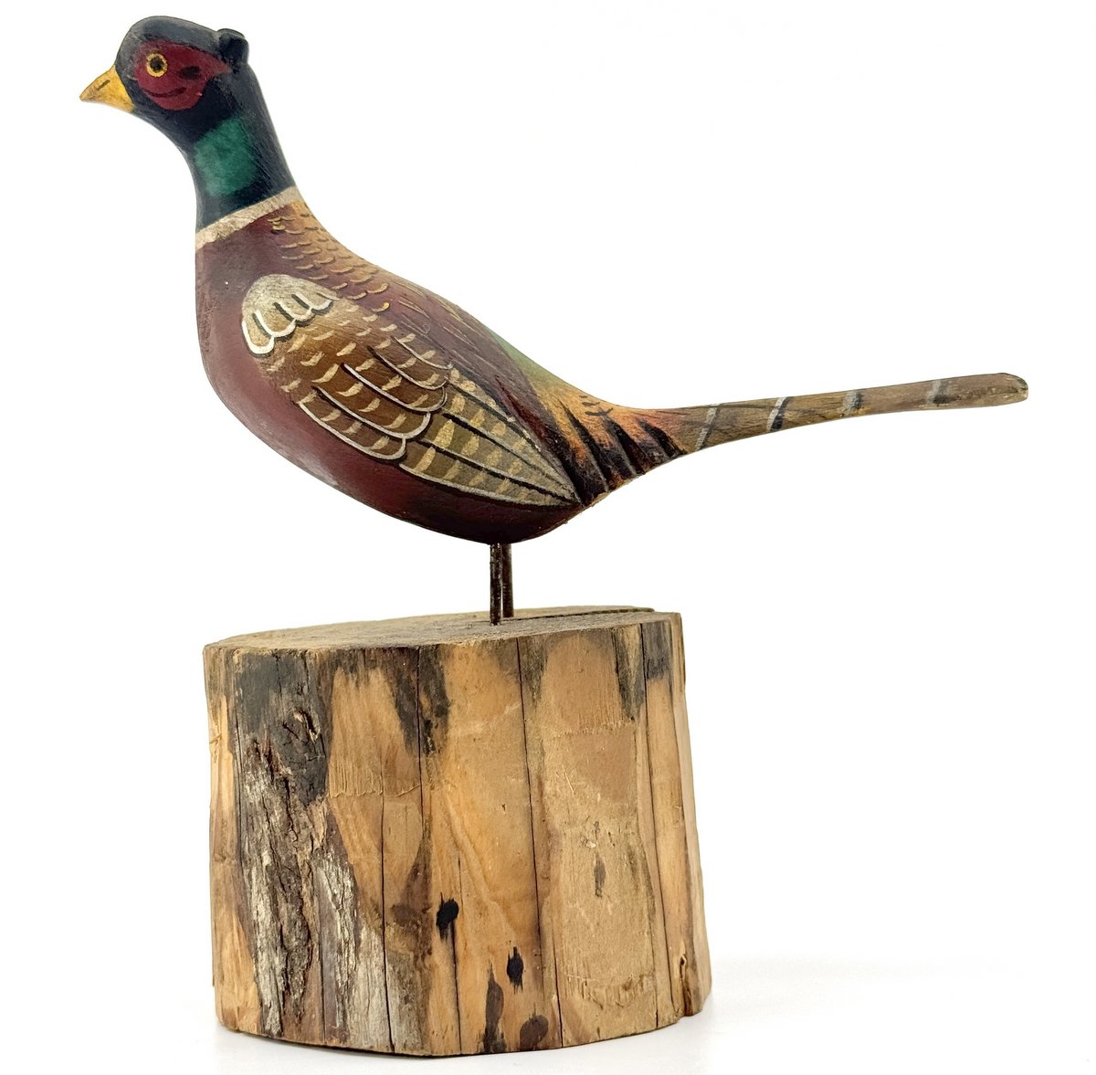 Exceptional paint-work to this folk art carved pheasant perched on a stump. Unsigned but looks to have some decent age.