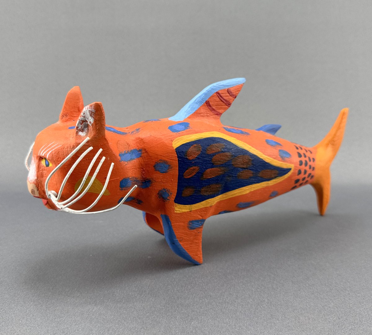 Whimsical carved and painted folk art "catfish" by Nova Scotia artist Ian Fancey.