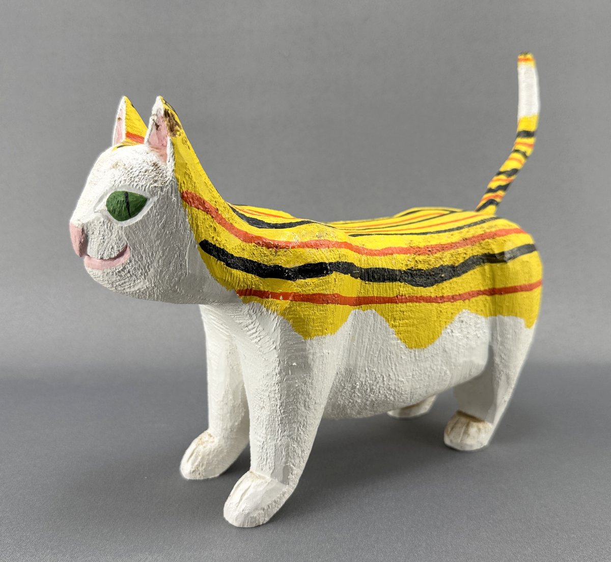 Carved and painted striped cat by Nova Scotia folk artist Mark Robichaud. 10" in length.