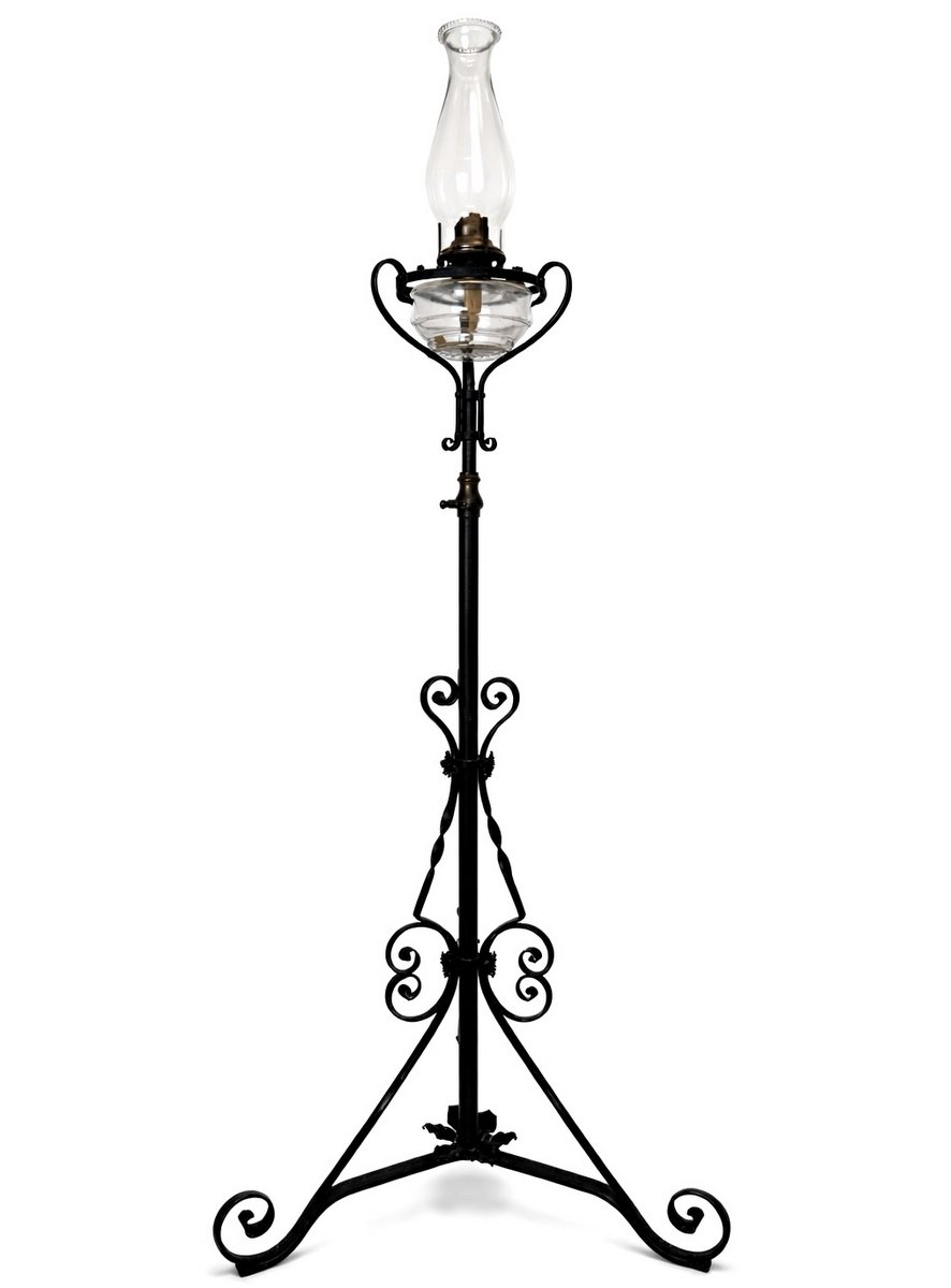 Oil lamp with ornate iron base with adjustable height circa 1920. Stands 47" at its shortest. A great lamp for outdoor entertaining.