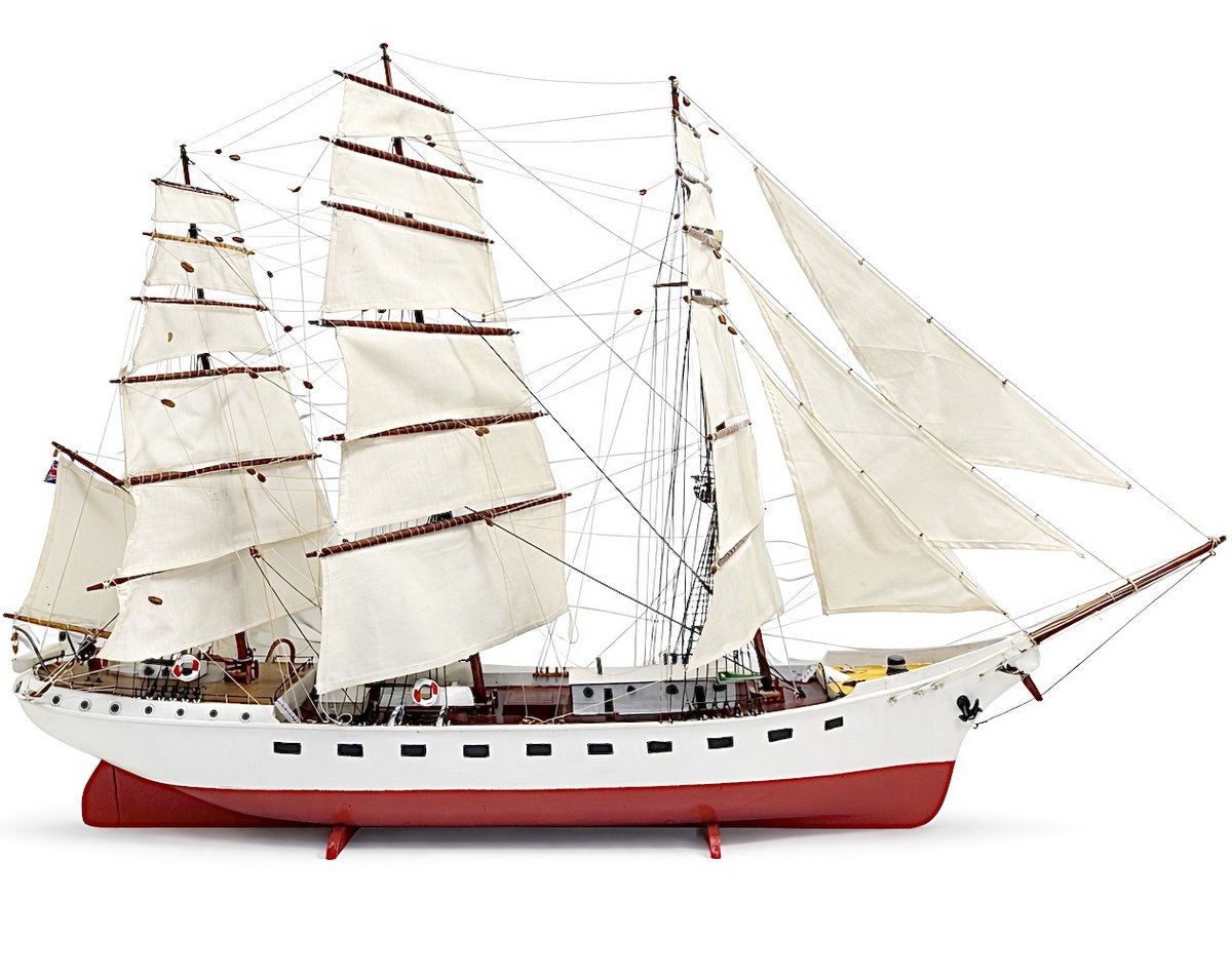 A large scratch-built 3-masted ship model measuring 4.5 feet long and 3 feet tall. Approximately 50 years old and in very good overall condition owing to the fact that it had been locked in a large display cabinet for most of its life. A couple minor pieces of loose rigging.