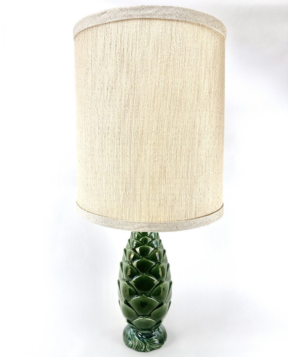 A large mid-20th century ceramic lamp of pine cone form with original period oversized shade. 32" total height.