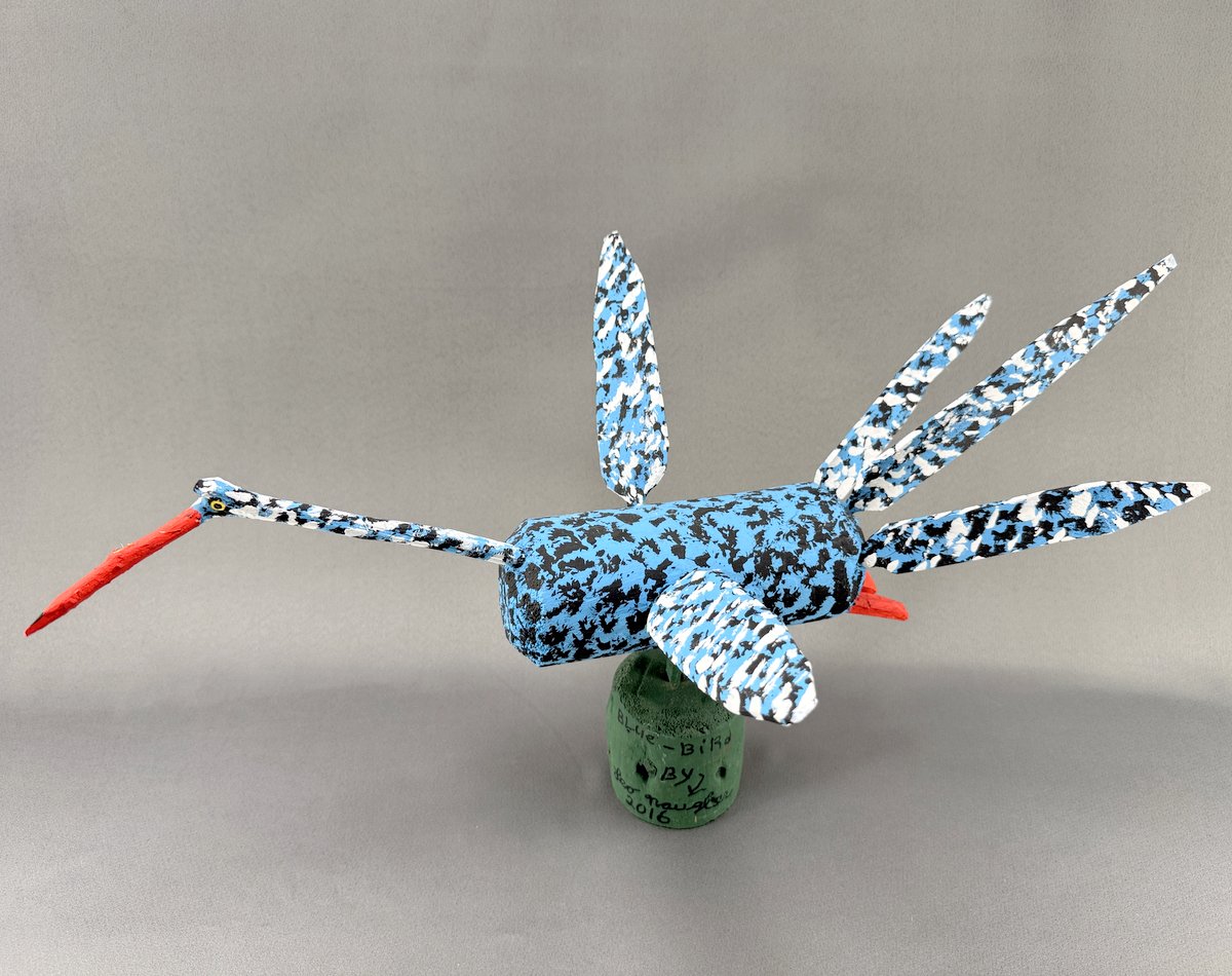 A fanciful carved and painted "bluebird" by first wave Nova Scotia folk artist Leo Naugler. Superb condition.