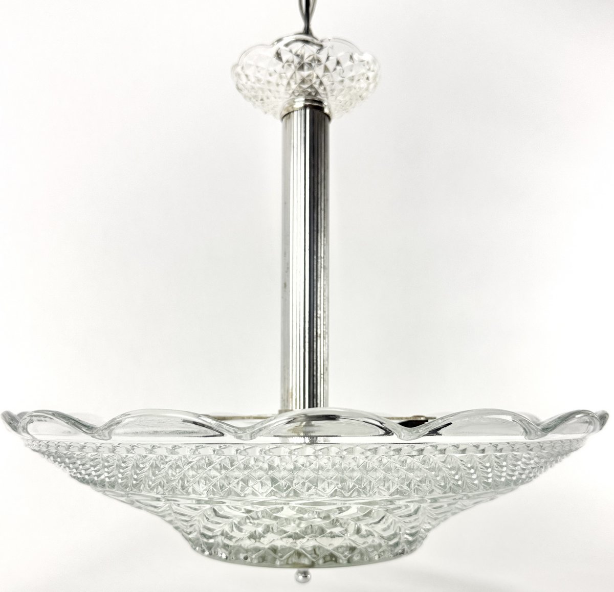 Pressed glass ceiling fixture of bowl form with chrome hardware by Lightolier, circa 1930. The bowl is 14" in diameter and the fixture with chain and canopy has a total drop of 30" although the chain could be considerably shortened. Fully re-wired and ready for hanging.