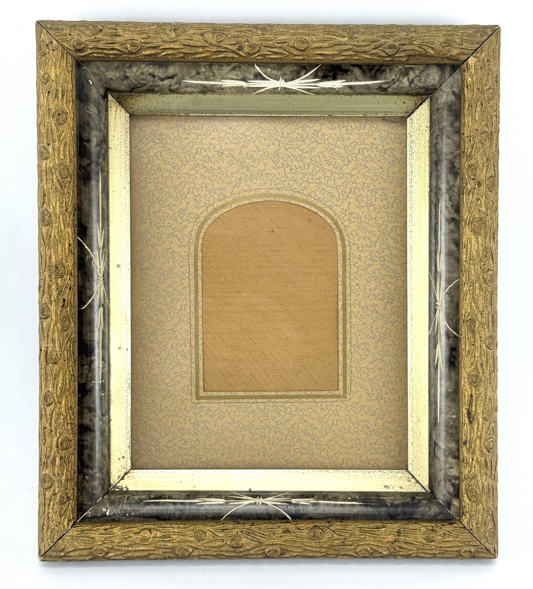 Late 19th/early 20th century shadow frame with plaster trim moulded with a naturalistic log pattern. Original interior mat. Interior mat will accomodate a 4" x 5.5" image and the overall frame size is 12" x 14". Excellent condition.