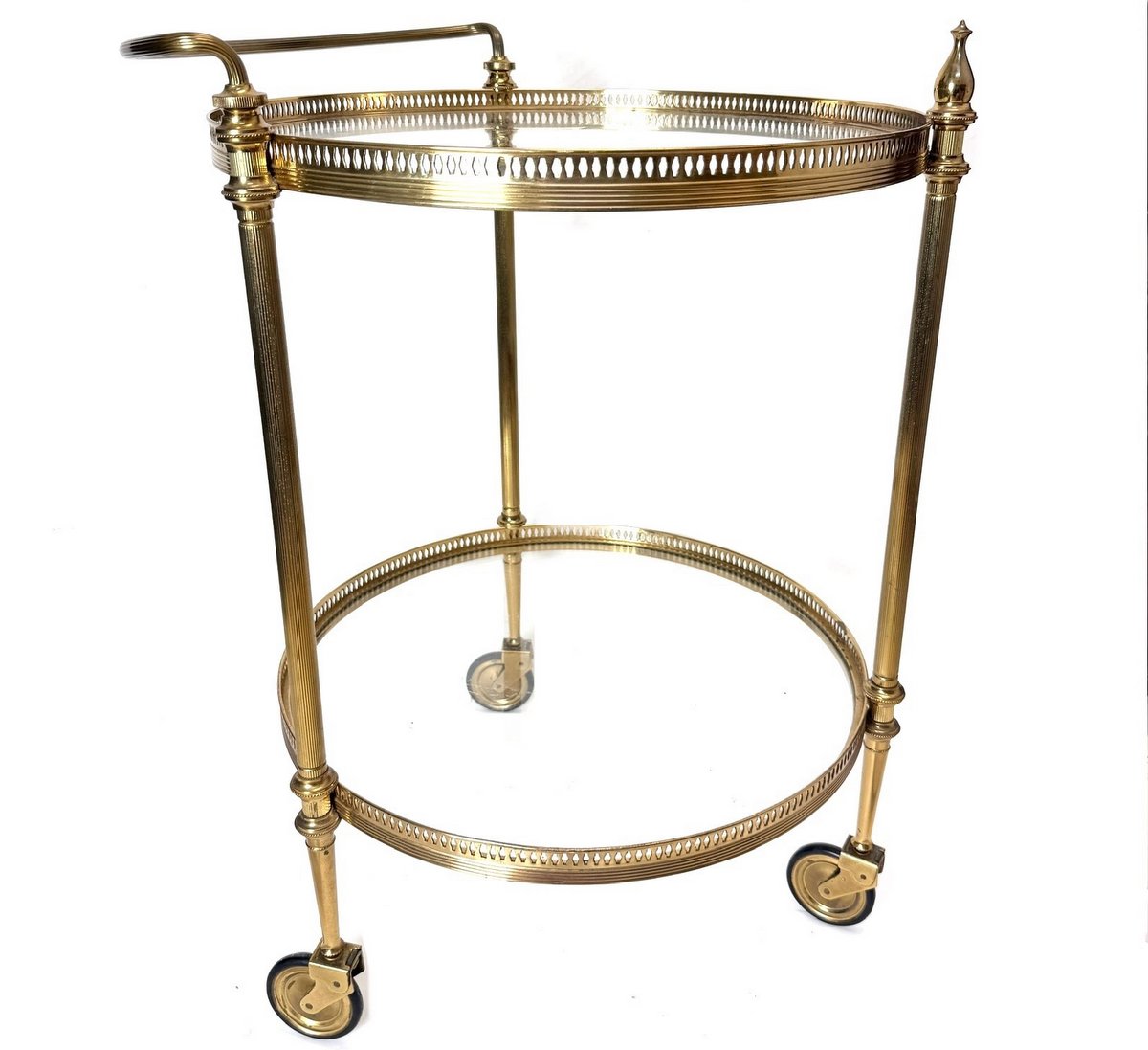 Mid-20th century European brass and glass cocktail trolley on wheels. 21" diameter and 27.5" in height. Excellent condition.