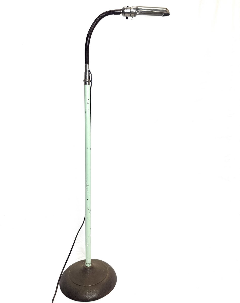 Circa 1940s iron-based medical task lamp with gooseneck featuring a nickeled shade. The lamp shaft's height is also adjustable. Stands 45" at its shortest.