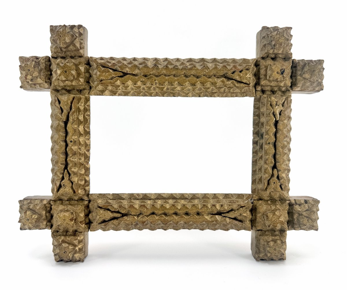 A miniature gold-painted chip-carved picture frame with inside dimensions of 3.25" x 5.25" -- ideal for a good postcard or small portrait. The overall frame dimensions are 7.5" x 9.5". Circa 1920.