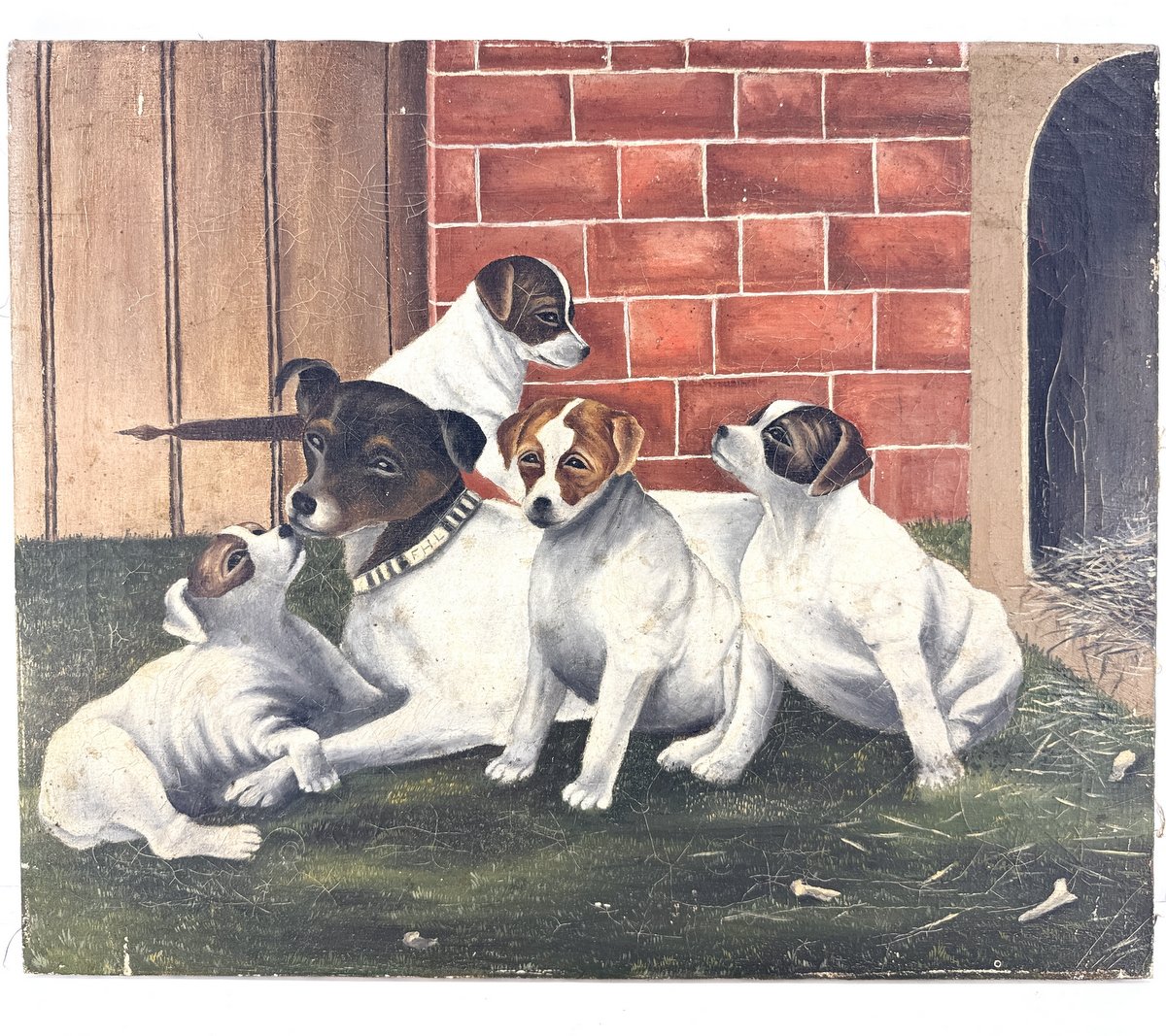 A naively-executed oil on canvas painting depicting a mother and her pups, circa 1900. Some craquelure to surface, otherwise fine.