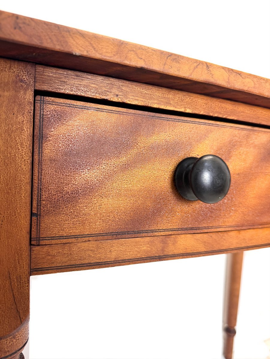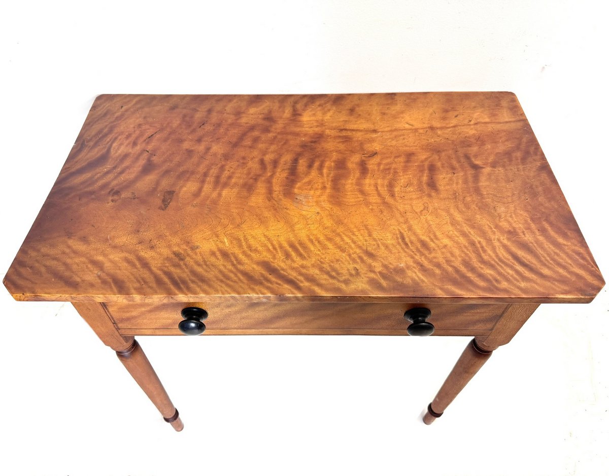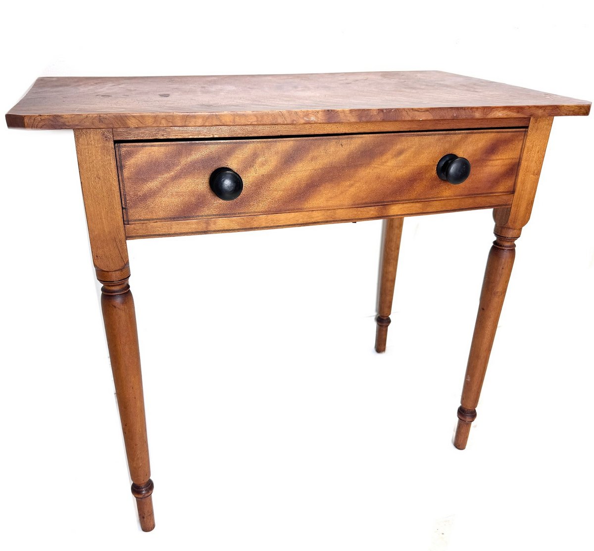 Superb, untouched 19th century flame birch single-drawer stand by the well-documented Trueman family of cabinetmakers from Point de Bute, New Brunswick. The Truemans produced some of the finest furniture to come out of Westmorland County and their pieces can be found in the Keillor House Museum, the New Brunswick Museum, as well as the King's Landing Collection. This stand was found in Amherst, Nova Scotia, only about 10km from where it would've been made, and had descended through a family with ties to the Truemans. The stand boasts a few subtle decorative features, such as the canted front corners, as well as the simple scribed lines on the drawer front. The stand is in a fine state of preservation, with original pulls and finish, and shows no signs of damage or restoration.