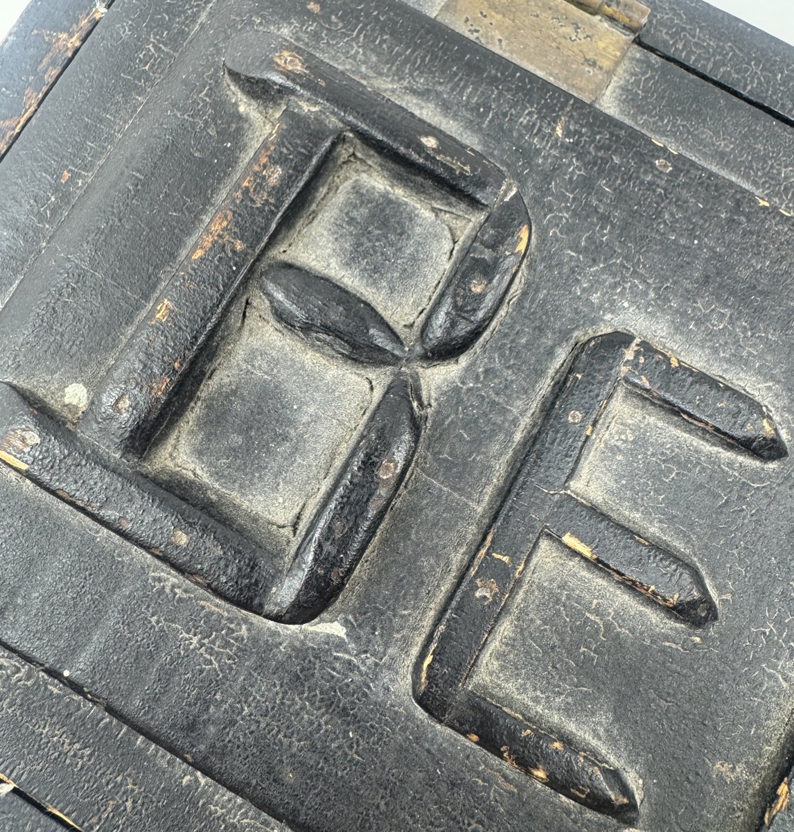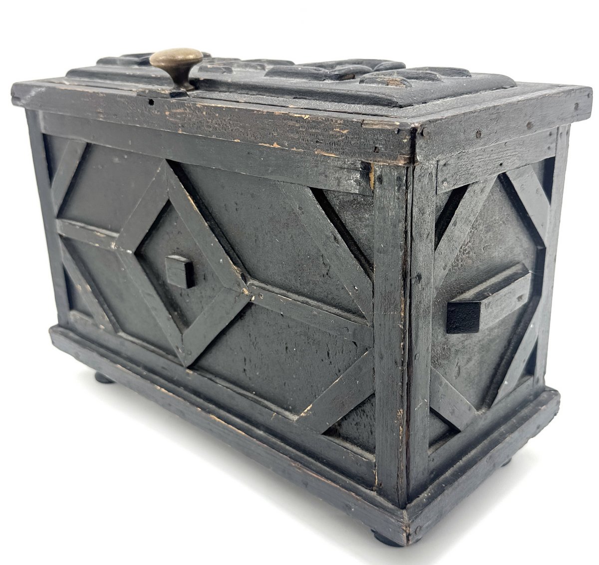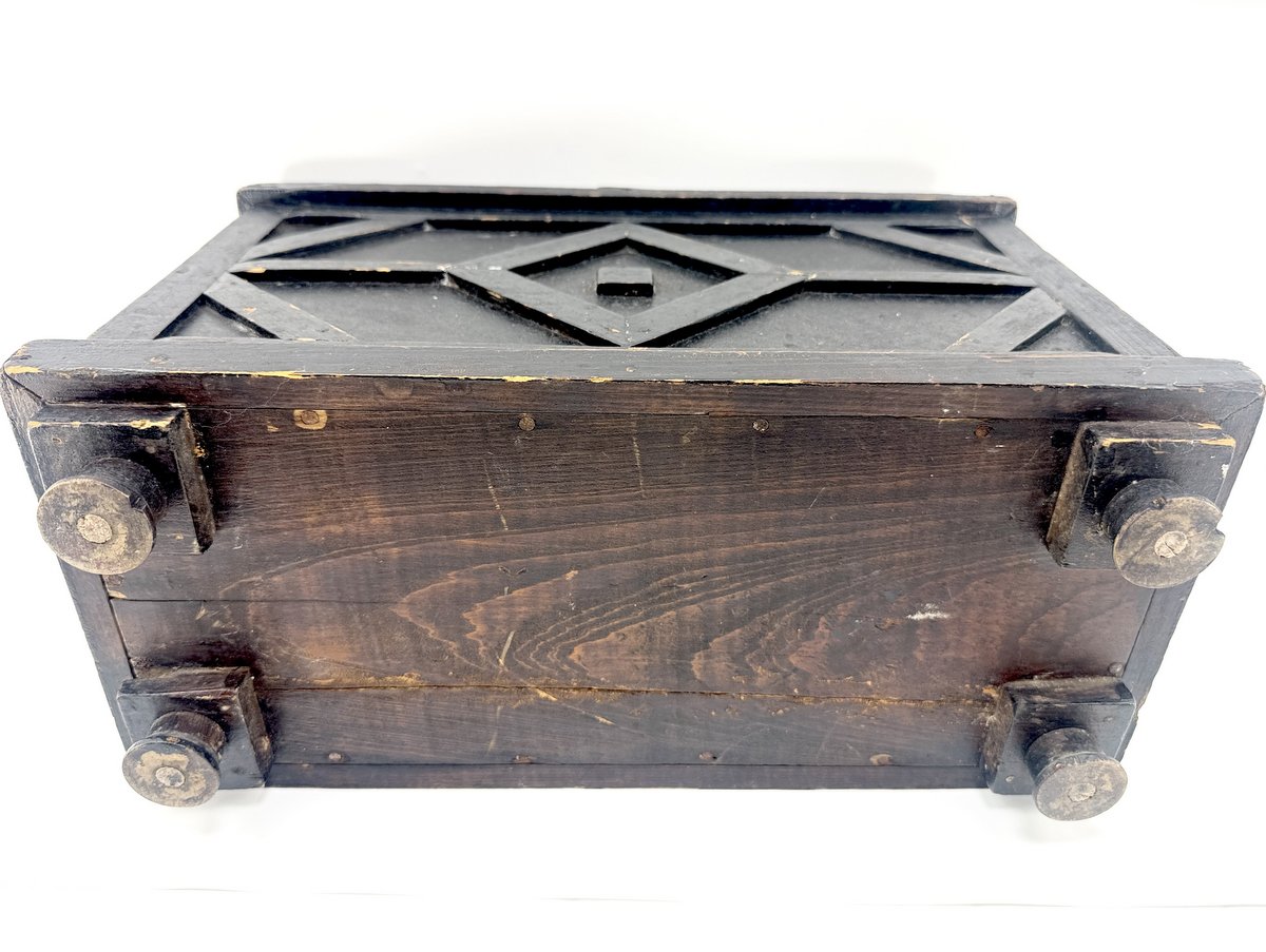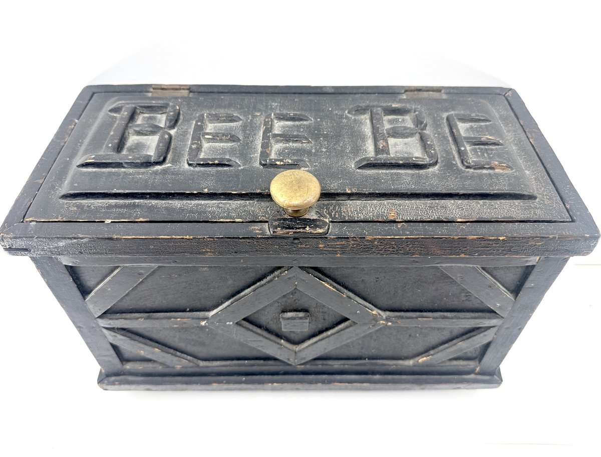 Wonderful circa 1930 Newfoundland folk art box in original green paint. Unique placement of hinges and creative use of spools are quirky things we've come to expect in pieces found on the rock. "Bee Be" is spelled out on the lid in two words. The overall box dimensions, as well as the unfinished interior that looks as though it may have held tools, suggests this may have been used as a hunter's gunning box to store shotgun loading and cleaning supplies -- it's possible the "Bee Be" could a play on words spelling out "BB", as in the bird shot often used for hunting fowl. Box dimensions are 15" x 10" x 7".