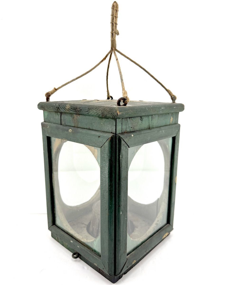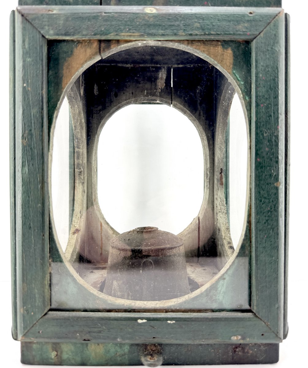 Very unusual circa 1900 ship's lantern completely hand-crafted from wood with glass panels. Sometimes materials were scarce in the remote outports of Newfoundland, so it's not surprising a unique creation such as this might present itself there. Original old green marine paint still intact, with white-painted interior. There is an oil burner inside but it is lacking the wick cap. This is the second time we've owned this particular lantern and it is originally from an old Newfoundland collection.