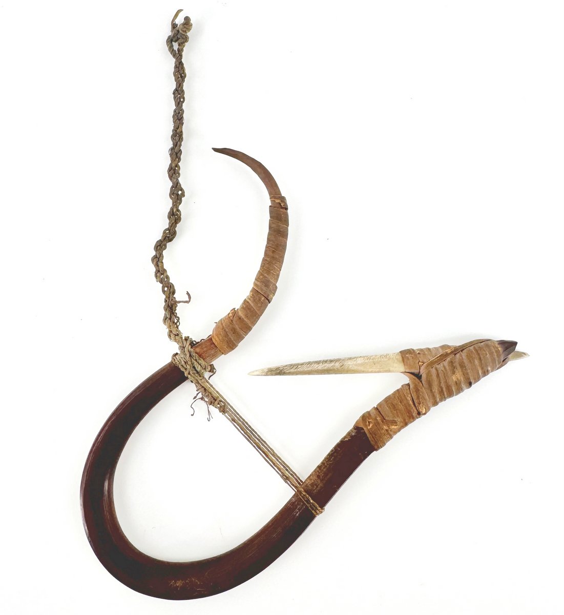 Exceptional, museum quality 19th century Northwest Coast indigenous halibut hook of elegant bentwood construction in a fine state of preservation. Bone barb secured with spruce root. One sinew line was designed to secure the hook to the fishing line, and the other longer sinew line was to secure the bait to the hook as well as to be used as a wrapping to keep the bentwood's proper shape when the hook is being stored. This is a very early example utilizing only natural materials. It is from the collection of Frederick Fitzgerald, first president of Imperial Oil in the late 19th century.