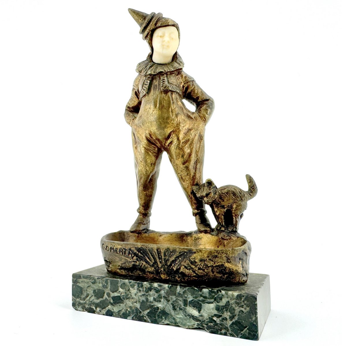 George Omerth Art Deco period French bronze sculpture of a pierrot and cat over a watering trough circa 1925. Carved ivory face. Marble base. 7" in height.