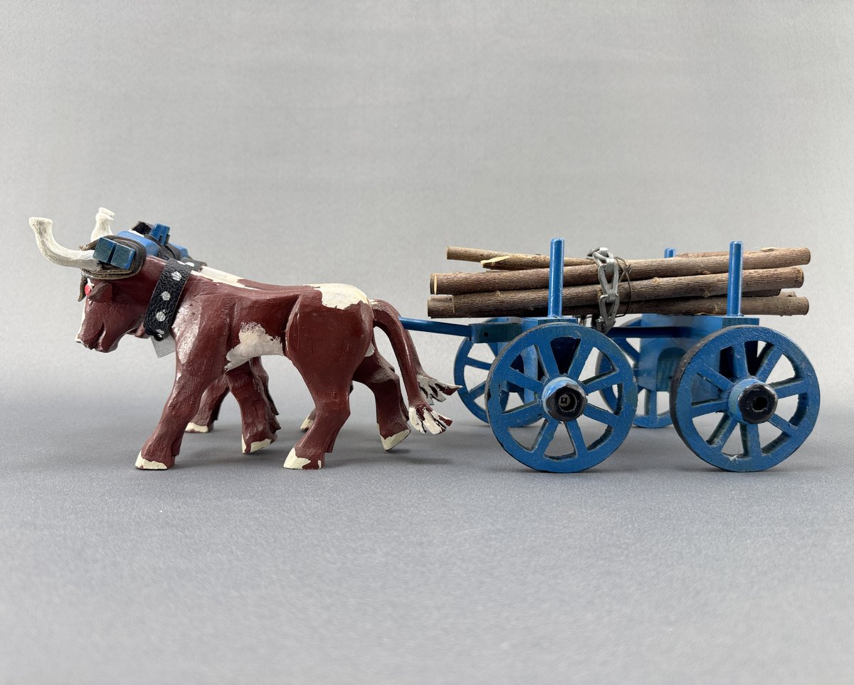 Nova Scotia folk art carving of a teak of oxen hauling a wagon full of logs. Unknown artist.