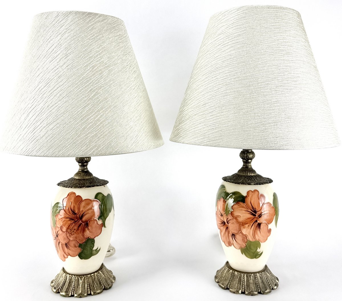 Matching pair of vintage Moorcroft pottery table lamps with new shades. 20" total height with shades. Price is for the pair.