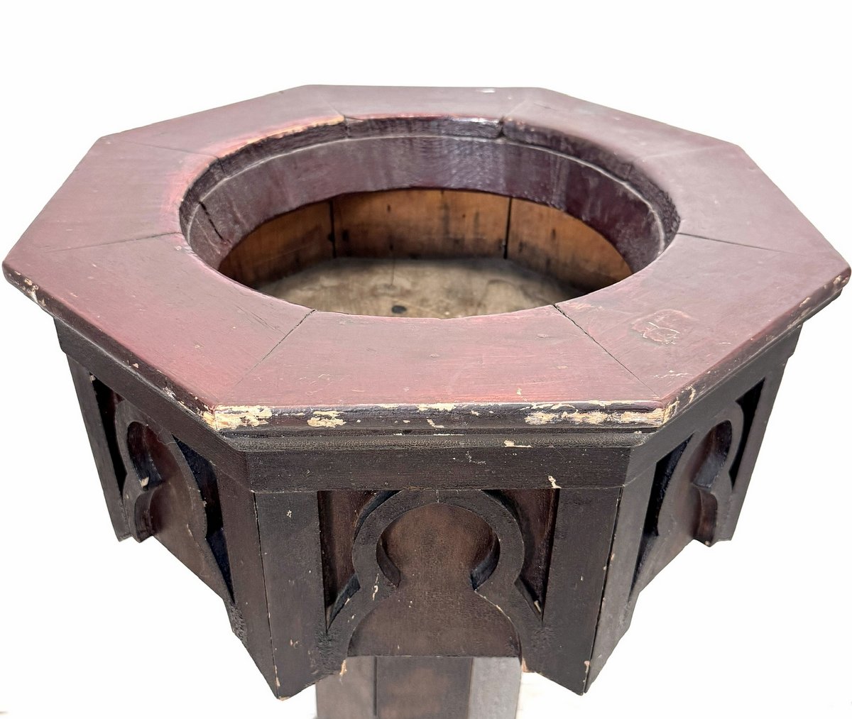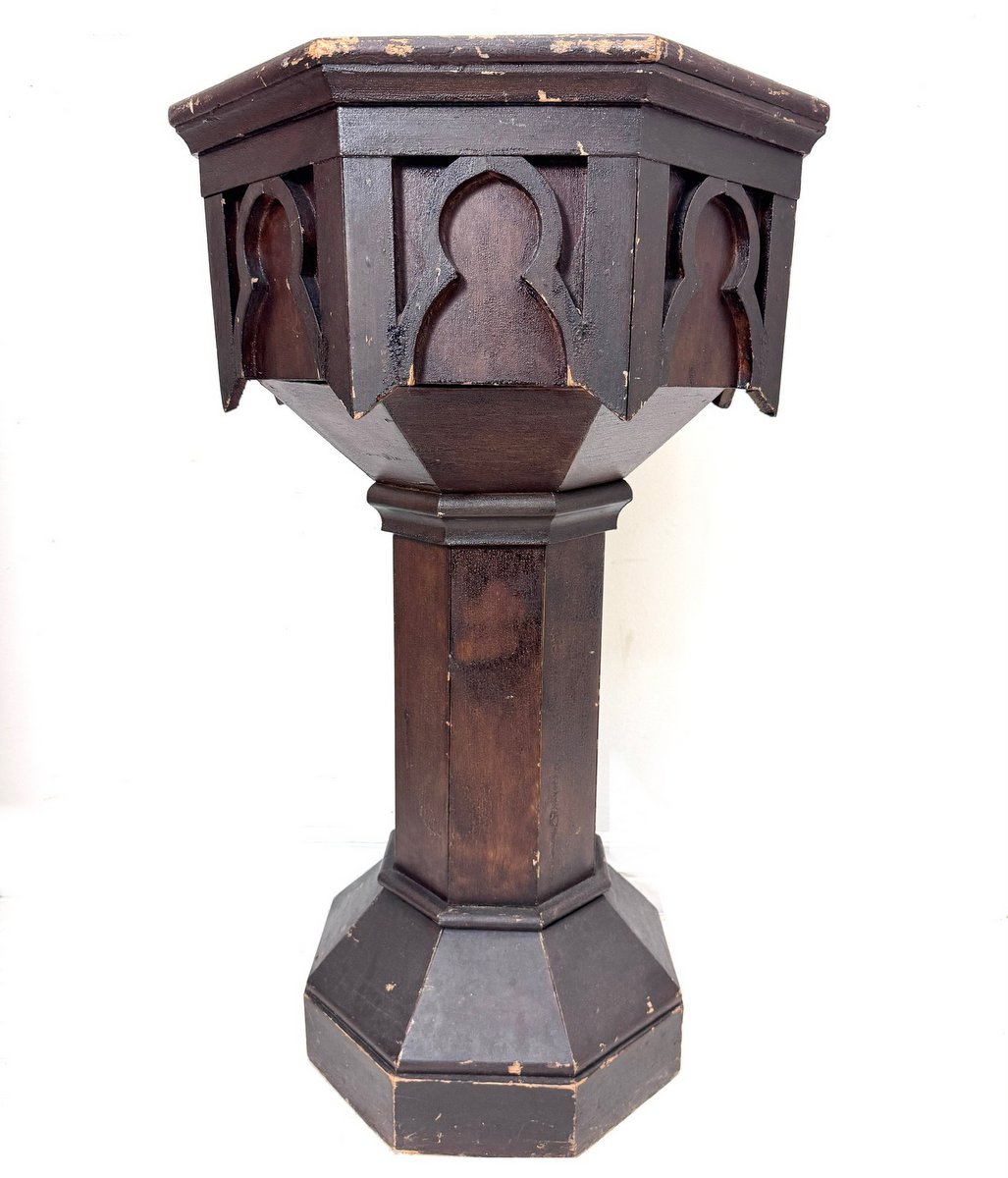 Late 19th century holy water font from a rural Nova Scotia church. Unlike the ornate oak, mahogany and walnut fonts you would find in affluent cities, this example was crafted from pine and stained to emulate a dark hardwood. Strong Gothic design influence of the late Empire period.