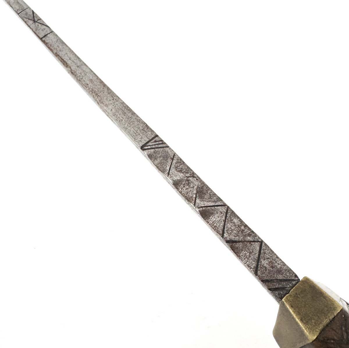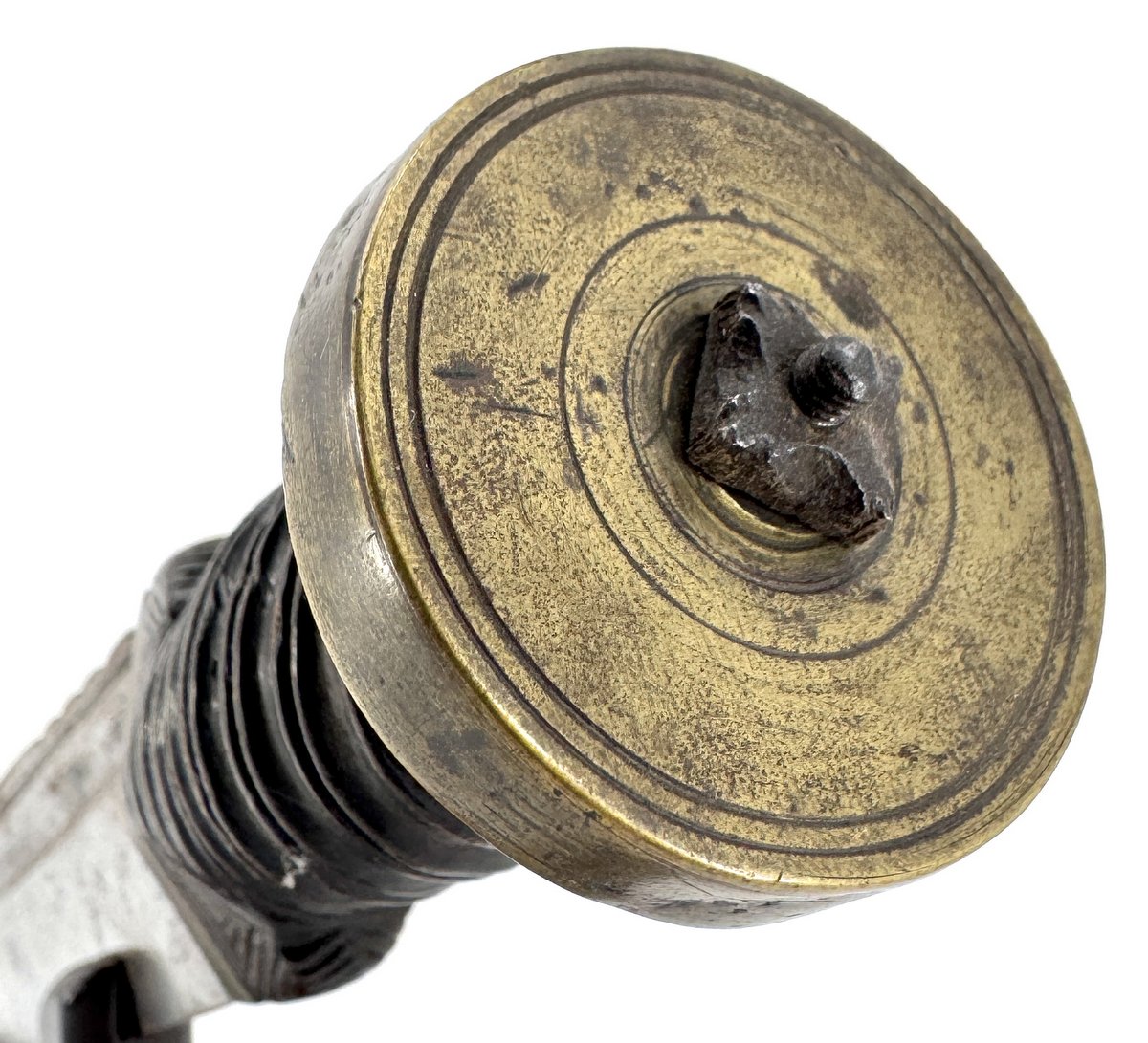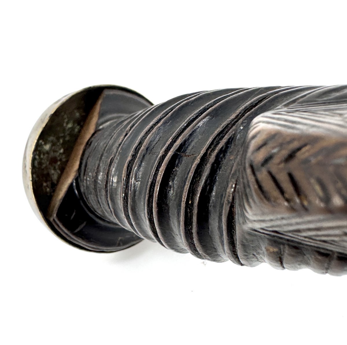 Original 18th century Scottish highlander's dirk circa 1780, the spine decorated with scallops and incised decoration, the handle with a rope-twist pattern and Celtic design at the shoulders. Original brass hilt ferrule and pommel cap, as well as original hand-cut iron pommel nut. Note that there is a chip to the handle only visible from the underside beneath the pommel cap. (See close-up.) The unique carved handle design, as well as noting that the handle looks to be of maple or birch, leaves open the possibility this dirk, or at the very least, its handle, could've been made here in Nova Scotia. A menacing 17" in total length. No scabbard. Display stand not included.