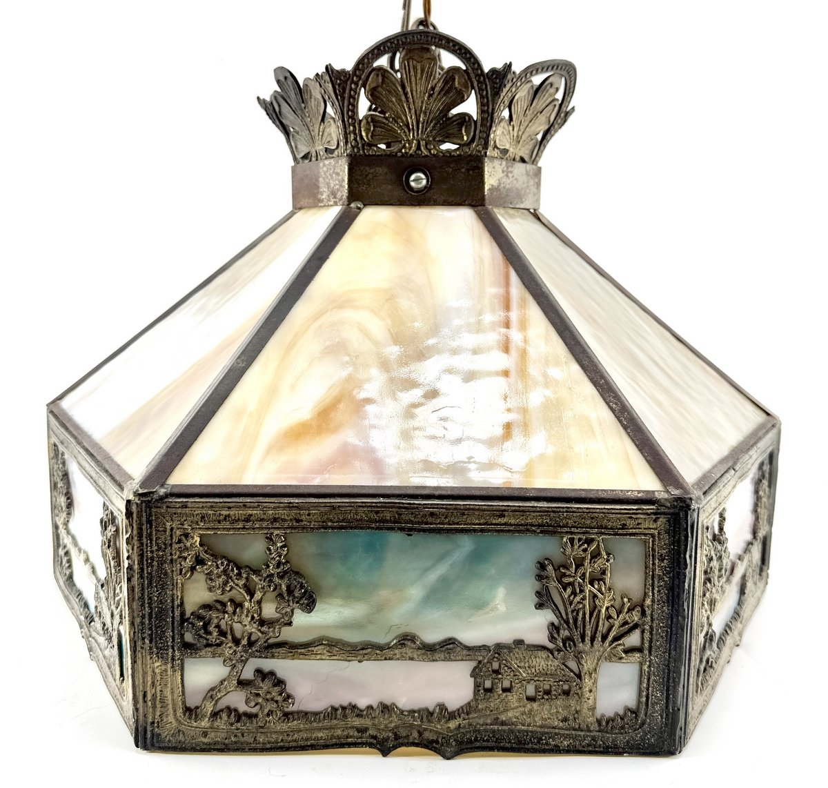 A 1920's era octagonal slag glass ceiling light with all original glass and scenic panels on each side. 16" diameter. Open bottom.