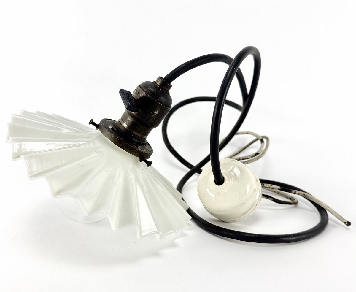 A small early 1900's milk glass crinoline shade hanging hall fixture with original socket, wiring and porcelain mount. 8" diameter.