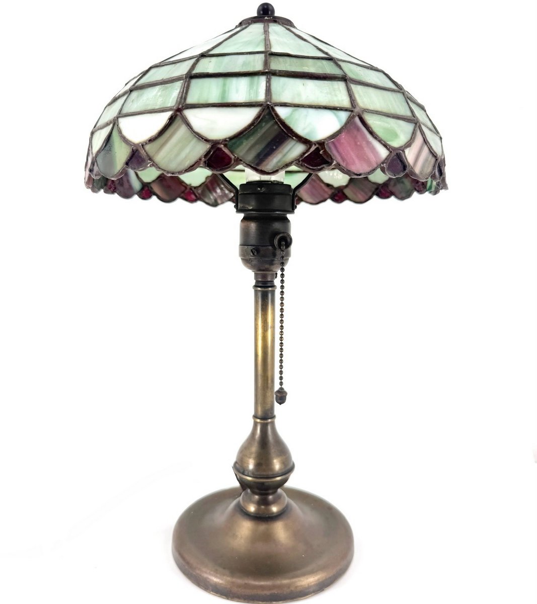 A good quality, early brass table lamp with period leaded glass shade circa 1920. A few stable panel cracks, otherwise excellent working order.