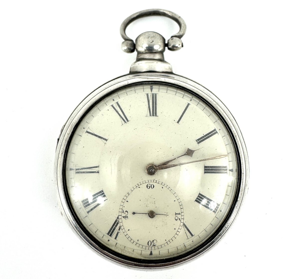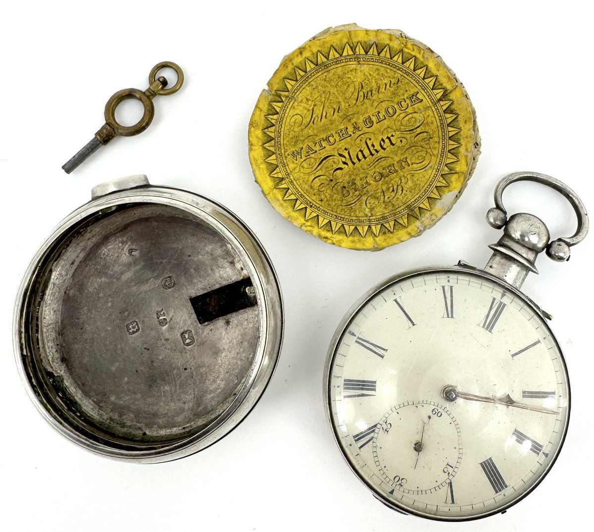 Early 19th century sterling silver pair-cased verge movement pocket watch with original paper for watchmaker John Burns of St. John New Brunswick. Circa 1835. The double sterling silver case with English hallmarks carries the stamps for Charles Read, Birmingham, 1833. John Burns emigrated from Scotland in the early 1800s and was listed as a watchmaker/jeweler in St. John. The 1830s is quite late for a verge movement, but interestingly, they were still in use at that time, mostly in provincial and Commonwealth regions.