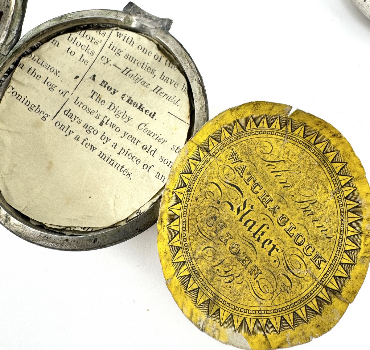 It is worth noting that pieces of newspaper were also often inserted into the back of pair cases to keep the movement from rattling around as well as help prevent dust from getting inside the key hole. This watch still has several pieces from a maritime newspaper tucked in behind the advertising paper, providing further provenance that the watch was in use in the maritimes during the early 1800s. The watch hands look to be original. The movement currently winds up and runs without difficulty.
