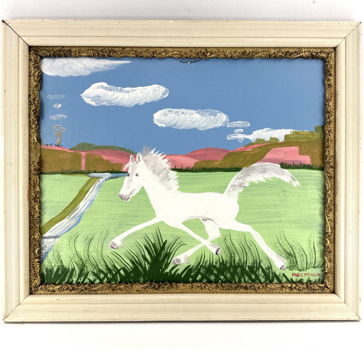 A larger size 16" x 20" painting on artist's board by Nova Scotia folk artist Fred Trask. Depicts a white stallion galloping in a field, with smoke billowing from a rancher's campfire deep in the distance. This is an older work dating from the 1980s, and nicely-framed. Total framed size is 20" x 24".